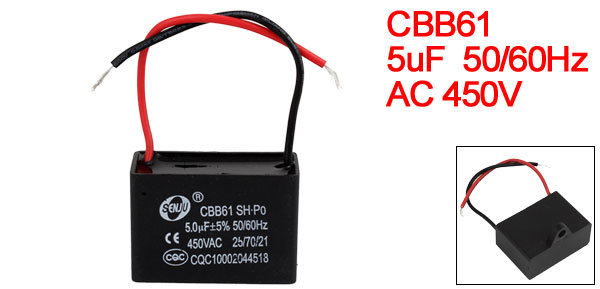 Product Name Motor Capacitor Model CBB61 External Material Plastic Dielectric Material Metalized Polypropylene Rated Capacitance 5uF Tolerance ±5% Rated Frequency 50/60Hz Rated Voltage AC 450V Size 4.7 x 3.7 x 3.2cm/ 1.85" x 1.46" x 1"(L*W*T) Hole Dia. 5mm/ 0.2" Cable Length 10cm/ 4" Weight 41g Package Content 1 x Motor Run Capacitor - Reviews