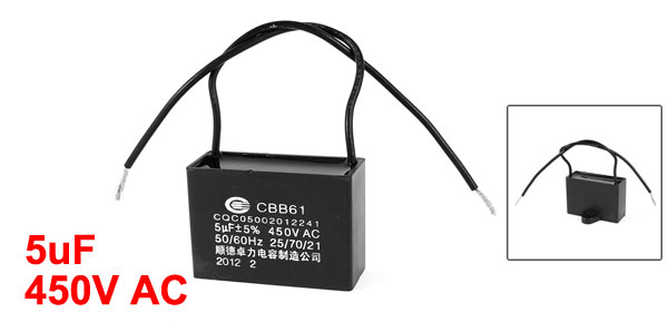 DetailsAC 450V 5uF 50/60Hz 5% 2-Wire Metalized Polypropylene Film Motor Capacitor Black  Product Name Motor Run Capacitor Model CBB61 Material Polypropylene Film Rated Capacitance 5uF Tolerance 5% Rated Frequency 50/60 Hz Rated Voltage 450V AC Overall Size 47 x 33 x 19mm/ 1.85" x 1.3" x 0.75"(L*W*T) Mount Hole Dia 5mm/ 0.2" Wire Length 12.5mm/ 4.9" Main Color Black Net Weight 36g Package Content 1 x Motor Run Capacitor