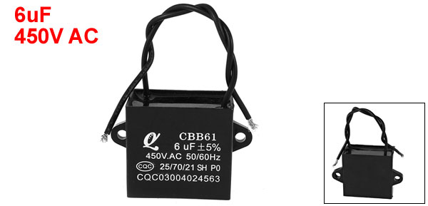 Product Name Motor Run Capacitor Model CBB61 Material Polypropylene Film Rated Capacitance 6uF Tolerance 5% Rated Frequency 50/60 Hz Rated Voltage 450V AC Overall Size 47 x 43 x 28mm/ 1.85" x 1.7" x 1"(L*W*T) Mount Hole Dia 5.4mm/ 0.21" Wire Length 11mm/ 4.3" Main Color Black Net Weight 69g Package Content 1 x Motor Run Capacitor - Reviews