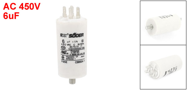Product Name Motor Capacitor Model CBB60A-1 Dielectric Material Polypropylene Film Housing Material Plastic Pin Quantity 4 Capacitance 6uF Tolerance ±5% Rated Frequency 50/60Hz Rated Voltage AC 450V Size 3.4 x 6.5cm / 1.3" x 2.6" (Dia.*H) Thread Diameter 8mm / 0.3" Color White Weight 59g Package Content 1 x Motor Capacitor - Reviews