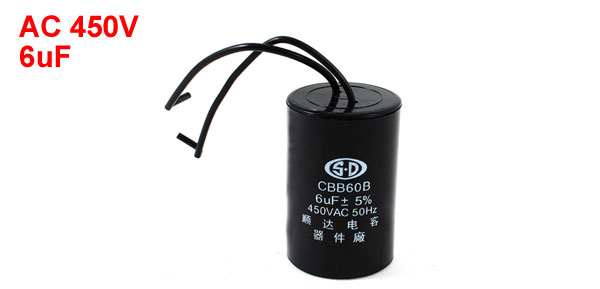 DetailsAC 450V 6uF 50Hz CBB60B Polypropylene Film Motor Run Capacitor  Product Name Motor Run Capacitor Material Polypropylene Film Model CBB60B Capacitance 6uF Tolerance ±5% Rated Voltage 450V AC Frequency 50Hz Body Size 5.6 x 3.6cm / 2.2" x 1.4" (D*H) Cable Length 9cm / 3.5" Main Color Black Weight 56g Package Content Motor Run Capacitor