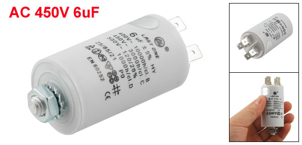 Product Name Motor Capacitor Dielectric Material Polypropylene Film Housing Material Plastic Capacitance 6µF Tolerance ±5% Rated Voltage AC 450V Size 3 x 5.5cm/ 1.2" x 2.2" (Dia.*H) Thread Diameter 8mm/ 0.3" Color White Weight 56g Package Content 1 x Motor Capacitor - Reviews