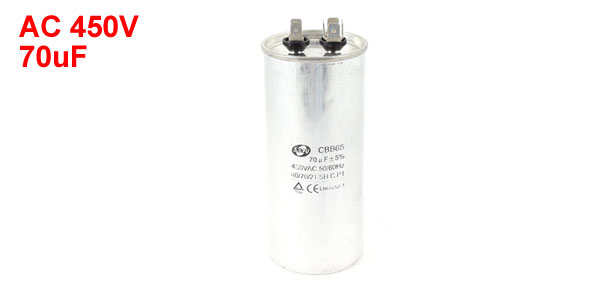 Product Name Motor Capacitor Housing Material Metal Dielectric Material Polypropylene Film Model CBB65 Capacitance 70uF Tolerance ±5% Ambient Temperature 40/70/21 Rated Voltage 450VAC Frequency 50/60Hz Body Size 5.5 x 13.8cm / 2.2" x 5.4" (D * H) Color Silver Tone Net Weight 279g Package Content 1 x Motor Capacitor