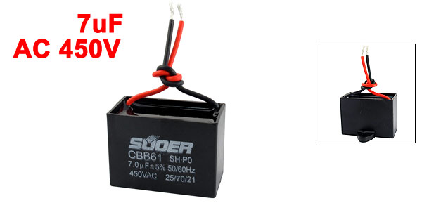 Product Name Motor Run Capacitor Model CBB61 Dielectric Material Metallized Polypropylene External Material Plastic Rated Capacitance 7uF Tolerance ±5% Rated Frequency 50/60Hz Rated Working Voltage AC 450V Mounting Hole Diameter 4mm / 0.16" Boby Size 4.8 x 3.5 x 2.5cm / 1.9" x 1.4" x 1" (L*W*H) Wire Length(Each) 10cm / 3.8" Main Color Black Weight 51g Package Content 1 x Motor Run Capacitor - Reviews