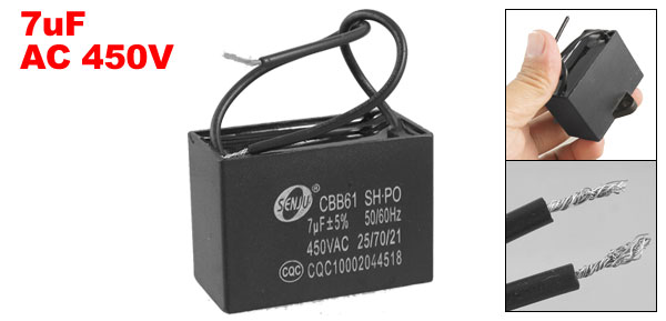 Product Name Motor Capacitor Model CBB61 External Material Plastic Dielectric Material Metalized Polypropylene Rated Capacitance 7uF Tolerance 5% Rated Frequency 50/60Hz Rated Voltage AC 450V Size 5 x 3.5 x 2.5cm/ 2" x 1.4" x 1"(L*W*T) Hole Dia. 4.5mm/ 0.18" Cable Length 10cm/ 3.6" Weight 49g Package Content 1 x Motor Run Capacitor - Reviews