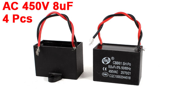 Product Name Motor Run Capacitor Model CBB61 Material Polypropylene Film Rated Capacitance 8uF Tolerance 5% Rated Frequency 50/60 Hz Rated Voltage 450V AC Overall Size 50 x 39 x 35mm/ 2" x 1.5" x 1.4"(L*W*T) Mount Hole Dia 4.8mm/ 0.19" Wire Length 9cm/ 3.5" Main Color Black,Red Net Weight 206g Package Content 4 x Motor Run Capacitor - Reviews