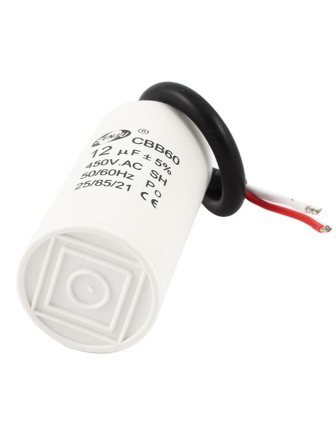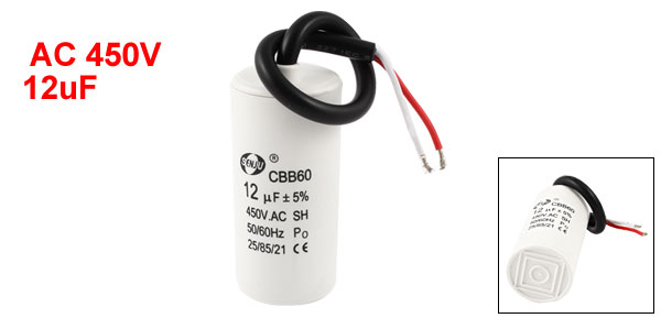 Product Name Motor Capacitor Housing Material Plastic Dielectric Material Polypropylene Film Model CBB60 Capacitance 12uF Tolerance ±5% Rated Voltage AC 450V Frequency 50/60Hz Body Size 3.4 x 7.3cm/ 1.3" x 2.8"(D*H) Wire Length 19cm / 7.5" Color White Weight 82g Package Content 1 x Motor Capacitor - Reviews