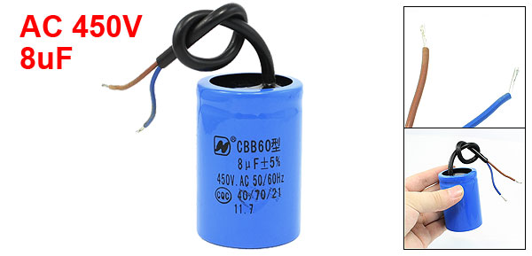 Product Name Motor Capacitor Housing Material Plastic Dielectric Material Polypropylene Film Model CBB60 Capacitance 8uF Tolerance ±5% Rated Voltage 450V AC Frequency 50/60Hz Body Size 6.2 x 4.2cm / 2.5" x 1.65" (H*D) Wire Length 21cm / 8.3" Color Blue Weight 124g Package Content 1 x Motor Capacitor - Reviews