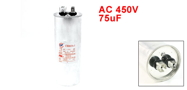 Product Name Motor Capacitor Material Polypropylene Film Model CBB65A-1 Type Anti-Explosion Capacitance 75uF Tolerance ±5% Rated Voltage AC 450V Frequency 50/ 60Hz Temperature Coefficient 40/70/21 Body Dimension 13.5 x 5cm/ 5.3" x 2"(H*D) Total Length 14.5cm/ 5.7" Color Silver Tone Weight 254g Package Content 1 x Motor Capacitor - Reviews