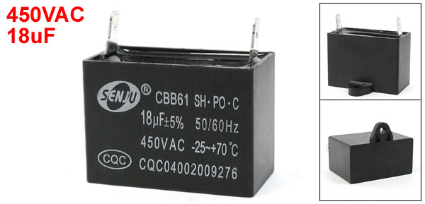 Product Name Motor Run Capacitor Material Polypropylene Film Rated Capacitance 18uF Tolerance ±5% Model CBB61 Rated Frequency 50/60 Hz Rated Voltage 450V AC Overall Size 49 x 26 x 35mm/ 1.9" x 1" x 1.38"(L*W*T) Mount Hole Dia 4mm/ 0.16" Pin Spacing 43mm/ 1.7" Main Color Black Weight 55g Package Content 1 x Motor Run Capacitor - Reviews