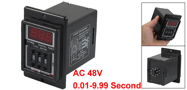 Product Name Time Relay Type ASY-3D Control Voltage AC 48V Frequency 50/60 Hz Contact AC 220V 5A Non-inductive Load Time Range 0.01-9.99 Second Mount Size (Approx.) 60 x 48 x 68mm/ 2.36" x 1.89" x 2.68" (L*W*Depth) Front Face Size 8.5 x 5.7cm / 3.3" x 2.2"(L*W) Mount Hole Diameter 4.5mm/ 0.18" Total Length 8.8cm / 3.5" Main Color Black Net Weight 205g Package Content 1 x Digital Time Relay - Reviews