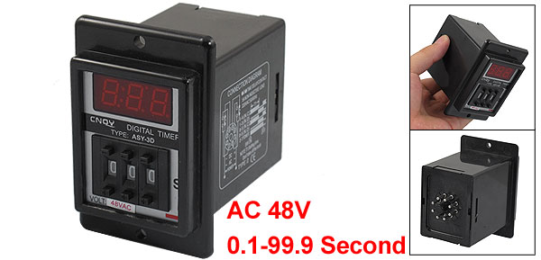 Product Name Time Relay Type ASY-3D Control Voltage AC 48V Frequency 50/60 Hz Contact AC 220V 5A Non-inductive Load Time Range 0.1-99.9 Second Mount Size (Approx.) 60 x 48 x 68mm/ 2.36" x 1.89" x 2.68" (L*W*Depth) Front Face Size 8.5 x 5.7cm / 3.3" x 2.2"(L*W) Mount Hole Diameter 4.5mm/ 0.18" Total Length 8.8cm / 3.5" Main Color Black Net Weight 205g Package Content 1 x Digital Time Relay - Reviews