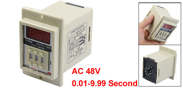 Product Name Time Relay Type ASY-3D Control Voltage AC 48V Frequency 50/60 Hz Contact AC 220V 5A Non-inductive Load Time Range 0.01-9.99 Second Mount Size (Approx.) 60 x 48 x 68mm/ 2.36" x 1.89" x 2.68" (L*W*Depth) Front Face Size 8.5 x 5.7cm / 3.3" x 2.2"(L*W) Mount Hole Diameter 4.5mm/ 0.18" Total Length 8.8cm / 3.5" Main Color Beige Net Weight 202g Package Content 1 x Digital Time Relay - Reviews