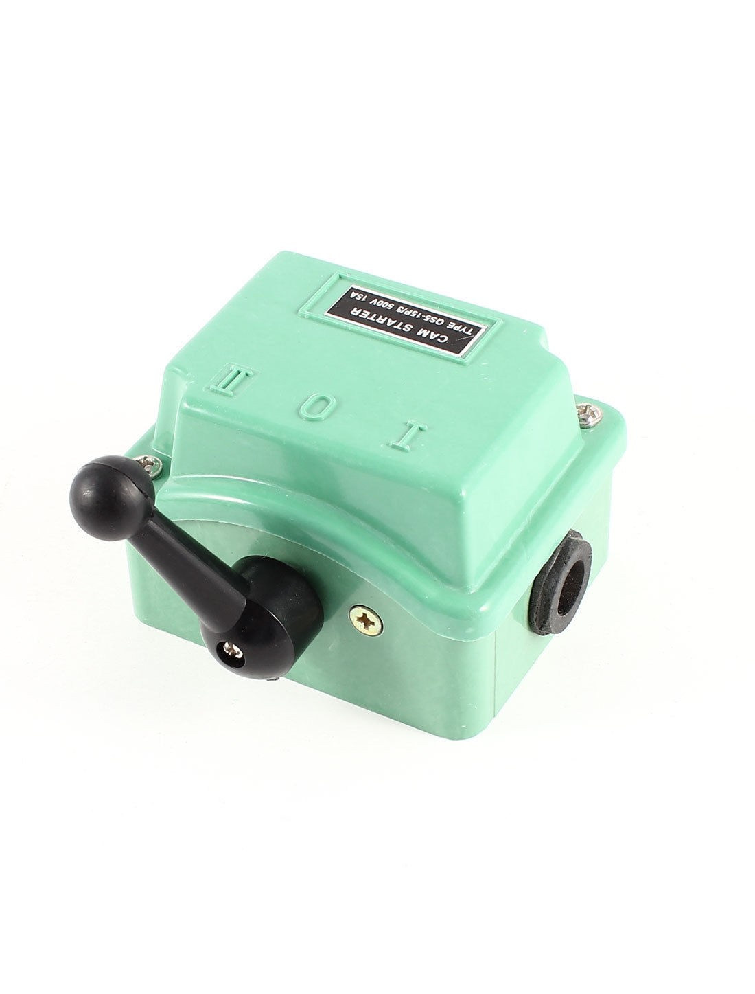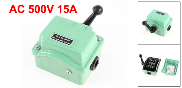 Product Name Reversing Drum Switch Model No. QS5-15P/3 Rated Voltage AC 500V Ith 15A Applications Forward, Stop, Reverse Main Body Size 90 x 70 x 60mm / 3.5" x 2.7" x 2.4"(L*W*H) External Material Metal Color Green Net Weight 272g Package Content 1 x Reversing Drum Switch