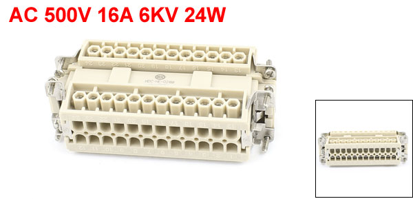 Product Name Industrial Connector Model No. HDC-HE-024M Contacts Type 24 Terminals, Male to Female Working Voltage AC 500V Working Current 16A Power 6KV Material Plastic, Metal, Electronic Parts Color Off White Overall Size 11 x 5.5 x 3.5cm/ 4" x 2.2" x 1.4" (L*W*H) Thread Diameter 3mm/ 0.12" Net Weight 227g Package 1 x Industrial Connector - Reviews