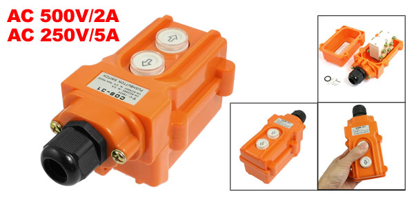 Product Name Hoist Pushbutton Switch Model No. COB-31 Push Buttons Up and Down Button Action Type Momentary Ue/Ie AC 500V/2A, AC 250V/5A Ith(AC-15) 10A Total Size 16 x 6.5 x 7cm/ 6.3" x 2.6" x 2.8"(L*W*H) Fit Cable Diameter 1.4cm/ 0.55" External Material Plastic Color Orange