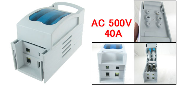 Product Name Fuse Isolating Switch Model No. HR17B-40/20 Fuse Type 14 x 51mm / 0.55" x 2"(D*H) Rated Voltage 500VAC Rated Current 40A Rated Limiting Short Current 50kA Rated Heating Current 40A Poles Quantity 2 Poles Mounted Hole Spacing 26mm / 1" Overall Size 115 x 55 x 74mm / 4.5" x 2.2" x 2.9"(L*W*H) External Material Plastic Color See the Picture Net Weight 254g Package Content 1 x Fuse Isolating Switch - Reviews