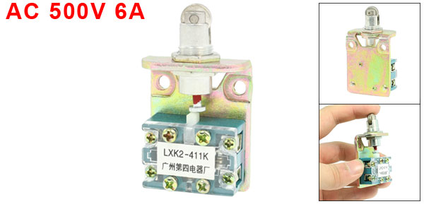 Product Name Limit Switch Model No. LXK2-411K Actuator Type Button Actuator Rating AC500V,6A Size(Approx) 6 x 3 x 3.5cm / 2.4" x 1.1" x 1.3"(L*W*H) Roller Size 10x3mm/0.4" x 0.11"(D*T) Fixing Holes Dia. 4mm / 0.15" Material Plastic & Metal Main Color Black Net Weight 66g Package Content 1 x Limit Switch - Reviews