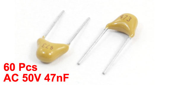 DetailsAC 50V 47nF 4.5mm Lead Spacing 2 Pin Multilayer Ceramic Capacitor 60pcs  Product Name Multilayer Ceramic Capacitor Main Material Ceramic Voltage AC 50V Capacitance 47nF Capacitance Tolerance ±10% Lead Spacing 4.5mm/ 0.18" Overall Size(Each) 14 x 5.5 x 2.5mm/ 0.55" x 0.22" x 0.1"(L*W*T) Net Weight 7g Color Yellow, Silver Tone Package Content 60(±2%) Pcs x Multilayer Ceramic Capacitor