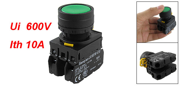 Product Name Push Button Switch Model YW1B-M1E11PG Action Type Momentary Type Contact Type 1 NO(Normally Open) + 1 NC(Normally Close) Ui 600V Ith 10A Current 600A Terminal Number 4 Panel Cutout Diameter 2.2cm / 0.87"(7/8") Fit Panel Thickness(Adjustable) Max 0.6cm / 0.24" Button Diameter 2.2cm/ 0.8" Overall Size 4.2 x 2.8 x 5.8cm/ 1.6" x 1.1" x 2.3" (L*W*H) Material Plastic, Electric Component Main Color Green, Black, Yellow Net Weight 33g Package Content 1 x Push Button Switch - Reviews