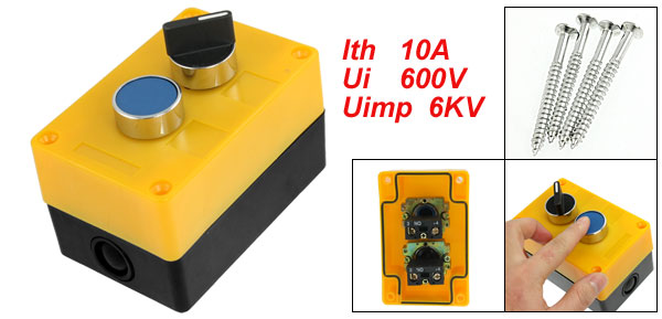 Product Name Push Button Switch Station Material Plastic, Metal Working Voltage AC 240V Working Current 3A Ith 10A Ui 600V Uimp 6KV Round Push Button Switch Action Type Momentary Selector Switch Mode on/off Contact Type 1NO, 1NO Overall Size(not include button) 10.9 x 7.1 x 6.4cm/ 4.3" x 2.7" x 2.5" (L*W*H) Button Diameter 2.8cm/ 1.1" Color Yellow, Blue, Black Weight 234g Package Content 1 x Push Button Switch Station - Reviews