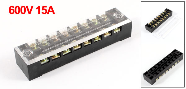 Product Name Barrier Terminal Block Model No. TB-1508 Material Metal, Plastic Rated Value 600V 15A Poles 8 Positions Dual Row Size 9 x 2.2 x 1.8cm/ 3.5" x 0.9" x 0.7" (L*W*T) Color Black Net Weight 36g Package Content 1 x Barrier Terminal Block - Reviews