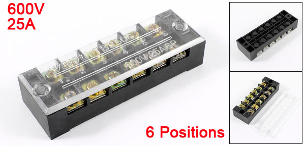 Product Name Barrier Terminal Block Model No. TB-2506 Material Metal, Plastic Rated Value 600V 25A Poles 6 Positions Dual Row Size 9.1 x 3 x 1.9cm/ 3.6" x 1.2" x 0.7" (L*W*T) Color Black Net Weight 55g Package Content 1 x Barrier Terminal Block - Reviews