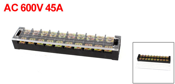 Product Name Barrier Terminal Block Model No. TB-4510L Material Metal, Plastic Rated Value AC 600V 45A Poles 10 Positions Dual Row Size 19 x 4 x 1.9cm/ 7.5" x 1.6" x 0.7" (L*W*T) Color Black Net Weight 183g Package Content 1 x Barrier Terminal Block - Reviews