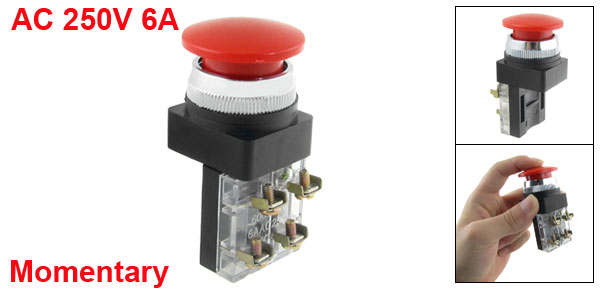 Product Name Push Button Switch Action Type Momentary Contact Type 1 NO(Normally Open) + 1 NC(Normally Close) Rated Voltage AC 250V, 600V Max. Rated Current 6A Terminals Quantity 4 Screw Terminals Panel Cutout Diameter 30mm / 1.2" Fit Panel Thickness Max 5mm / 0.2" Button Diameter 38mm / 1.5" Overall Size 40 x 35 x 78mm/ 1.6" x 1.4" x 3.1"(L*W*H) Material Plastic, Metal Color Red, Black Weight 49g Package Content 1 x Push Button Switch - Reviews