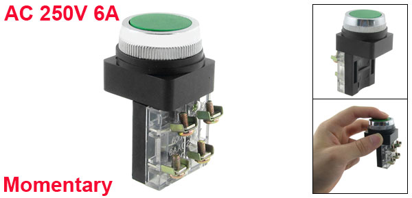 Product Name Push Button Switch Action Type Momentary Contact Type 1 NO(Normally Open) + 1 NC(Normally Close) Rated Voltage AC 250V, 600V Max. Rated Current 6A Terminals Quantity 4 Screw Terminals Panel Cutout Diameter 30mm / 1.2" Fit Panel Thickness Max 5mm / 0.2" Button Diameter 25mm / 1.0" Overall Size 42 x 36 x 65mm / 1.65" x 1.4" x 2.6"(L*W*H) Material Plastic, Metal Color Green, Black Weight 45g Package Content 1 x Push Button Switch - Reviews
