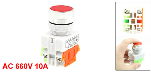 Product Name Push Button Switch Model Y090-11BN Contact Type 1NO 1NC (DPST) Action Type Latching Ith 10A Ui 660V Terminal Quantity 4 Button Diameter 23mm / 0.9" Male Thread Dia 24mm / 0.9"(7/8") Fit Panel Max. Thickness 6mm / 0.24" Total Size(Approx) 62 x 36 x 30mm / 2.4" x 1.4" x 1.1"(L*W*T) External Material Plastic, Metal Button Color Red Net Weight 34g Package Content 1 x Push Button Switch - Reviews