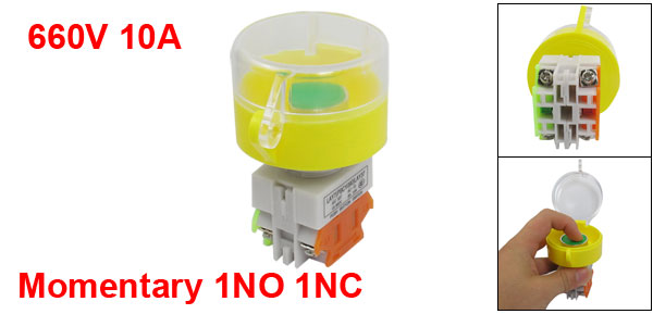 Product Name Pushbutton Switch Action Type Momentary Button Type Flat Button Contact Type 1NO 1NC(DPST) Ui(AC-15) 660V Ith(AC-15) 10A Terminals Quantity 4 Screw Terminals Thread Diameter 24mm/0.94" Button Diameter 24mm/0.94" Protection Cover Diameter 55mm/2.17" Suitable Board(Max.) 5mm/ 0.197"(Adjustable) Overall Size 73 x 55 x 82mm / 2.87" x 1.89" x 3.23" (L*W*H) Material Plastic, Metal, Electric Parts Button Color Green Color Gray, Yellow, Green Net Weight 50g Package Content 1 x Pushbutton Switch - Reviews
