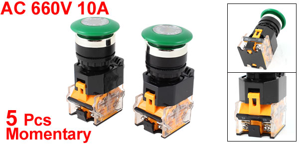 DetailsAC 660V 10A DPST Green Mushroom Cap 4 Screw Terminal Emergency Stop Switch 5Pcs  Product Name Push Button Switch Contact Type 1NO 1NC(DPST) AC-15 Ue:AC380V/220V