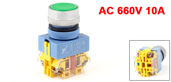 DetailsAC 660V 10A DPST Momentary Green Mushroom Head Push Pull Button Switch  Product Name Push Button Switch Contact Type 1NO 1NC (DPST) Action Type Momentary(Green Mushroom) Ith 10A Ui 660V Terminal Quantity 4 Fit Panel Max. Thickness 6mm / 0.24" Button Diameter 2.8cm / 1.1" Total Size(Approx) 3.7 x 3 x 6.2cm / 1.5" x 1.2" x 2.4" (L*W*H) External Material Plastic, Metal Button Color Green Net Weight 43g Package Content 1 x Push Button Switch