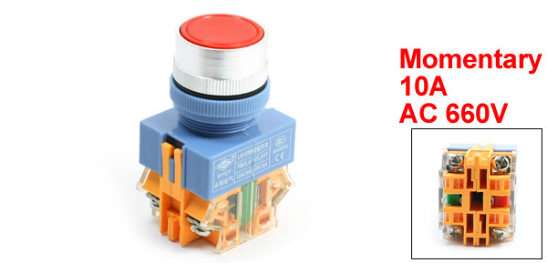 Product Name Push Button Switch Action Type Momentary Contact Type 1NO, 1NC (DPST) Ith 10A Ui AC 660V Terminal Number 4 Screw Terminals Button Color Red Button Diameter (Approx.) 2.3cm / 0.91" Mounting Hole Diameter 23mm / 0.87" Mounting Length 7mm/0.28" Overall Size(Approx.) 6.4 x 3.7 x 3cm/2.5" x 1.5" x 1.2"(L*W*H) Material Plastic, Metal Net Weight 42g Package Content 1 x Push Button Switch - Reviews