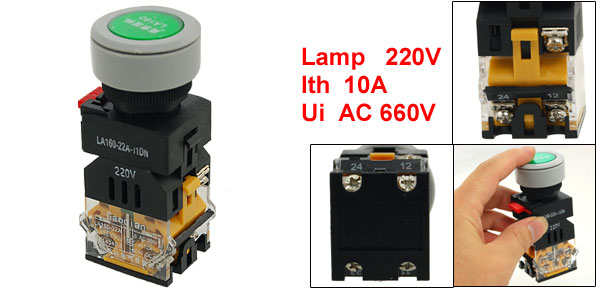Product Name Push Button Switch Model No. LA160-22A-11DN Contact Type 1NO + 1NC Action Type Momentary Ith 10A Ui AC 660V Lamp Rated Voltage 220V Panel Cutout Diameter 2.2cm / 0.87"(7/8") Fit Panel Thickness(Adjustable) Max 0.5cm / 0.2" Button Diameter 2.4cm / 0.94" Total Size 3.6 x 2.9 x 8.5cm / 1.4'' x 1.1'' x 3.3'' (L*W*H) Main Material Plastic, Metal Main Color Push Button: Green Body: Black, Yellow, Red, Gray Weight 70g Package Content 1 x Push Button Switch - Reviews