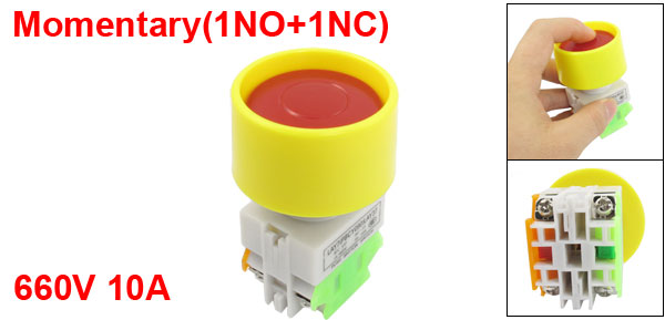 Product Name Push Button Switch Material Plastic, Metal Action Type Momentary Contact Type 1NO+1NC Ith 10A Ui 660V IEC 337 Terminal Quantity 4 Mount Hole Diameter 22mm / 7/8" Fit Panel Thickness(adjustable) 6mm / 15/64"(max.) Total Size (Approx.) 46 x 75mm / 1.8" x 3"(D*H) Button Color Red Weight 54g Package Content 1 x Push Button Switch - Reviews