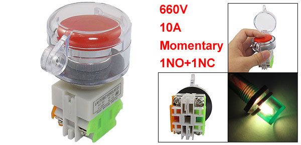 Product Name Push Button Switch Material Plastic, Metal Action Type Momentary Contact Type 1NO+1NC Ith 10A Ui 660V IEC 337 Terminal Quantity 4 Mount Hole Diameter 22mm / 7/8" Fit Panel Thickness(adjustable) 6mm / 15/64"(max.) Total Size (Approx.) 47 x 77mm / 1.9" x 3"(D*H) Button Color Red Weight 60g Package Content 1 x Push Button Switch - Reviews