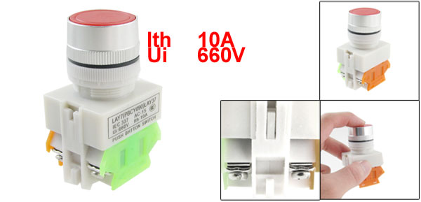 Product Name Push Button Switch Material Plastic, Metal Action Type Momentary Contact Type 1NO(Normally Open) + 1NC(Normally Close) Ith 10A Ui 660V Terminal Number 4 Screw Terminals Button Diameter (Approx.) 24mm / 0.9" Mounting Hole Diameter 22mm / 0.87"(7/8") Overall Size(Approx.) 37 x 30 x 63mm / 1.5" x 1.2" x 2.5"(L*W*H) Button Color Red Net Weight 36g Package Content 1 x Push Button Switch - Reviews