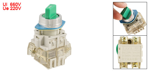 Product Name Rotary Selector Push Button Switch Model LAY3-11X Contact Type 1 NO(Normally Open) + 1 NC(Normally Close) Selector Button Position 2 Position Ith 10A Ui 660V Ie 4.5A Ue 220V Mount Hole Diameter 2.2cm / 0.87"(7/8") Fit Panel Thickness Max 0.7cm / 0.27" Knob Size 1.9 x 0.8cm / 0.7'' x 0.3'' (L*W) Total Size 4.5 x 3.2 x 7.5cm / 1.77'' x 1.26'' x 2.95'' (L*W*H) Main Material Plastic, Metal Main Color Green, Blue Weight 53g Package Content 1 x Rotary Selector Push Button Switch - Reviews