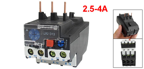 DetailsAC 660V 2.5A 4A 2.5-4A 3 Pole Thermal Overload Relay NO NC LR2-13  Product Name Thermal Overload Relay Model LR2-13 NO 98, 97 NC 96, 95 Setting Current 2.5-4A Ui 660V Ith 5A Tripping Class 10A Pole 3 Pole Total Size (Approx.) 47 x 44 x 87mm/ 1.9" x 1.7" x 3.4"(L*W*T) Color As Picture Shown Weight 150g Package Content 1 x Thermal Overload Relay