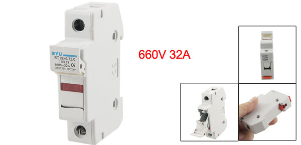 Product Name Fuse Holder Model No. RT18M-32 Rated Voltage 660V Rated Current 32A fit Rail Width 35mm fit Fuse Link Size 38 x 10mm/1.5" x 0.39"(L*Dia) Total Size 7.9 x 6.2 x 1.8cm/3.11" x 2.44" x 0.75"(L*W*T) Material Ceramic, Plastic, Metal Main Color White Net Weight 61g Package Content 1 x Fuse Holder - Reviews