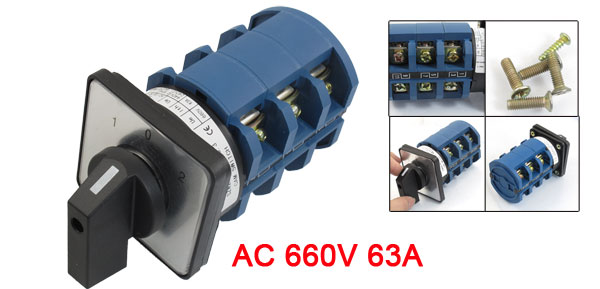Product Name Changeover Switch Model No. SZW26-63/D303.3 Ui 660V Ith 63A Ue 440V, 240V AC-15 4A,5A AC-3 5.5A AC-2 7.5A AC-4 1.5A Positions 3Positions(1-0-2) Terminal Number 12 Fit for Panel Thickness 5mm/0.2" Body Diameter 65mm / 2.6" Overall Size(Approx.) 65 x 65 x 130mm / 2.6" x 2.6" x 5.1"(L*W*H) Fixing Mount Hole Distance 48mm/1.9" External Material Plastic Net Weight 418g Package Content 1 x Changeover Switch