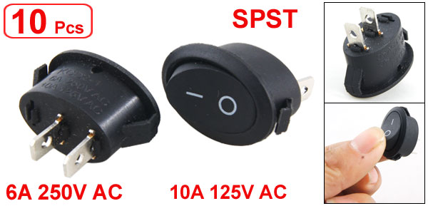 Product Name Rocker Switch Poles SPST Terminals 2 Pin (On - Off) Rating Voltage 6A 250V AC 10A 125V AC Total Size(Each One) 2.7 x 1.7 x 2.7cm / 1.1" x 0.7" x 1.1"(L * W * T) Mount Hole Size 2.3 x 1.4cm / 0.9" x 0.55"(L*W) Color Black Material Plastic & Metal Total Weight 33g Package Content 10 x Rocker Switch - Reviews