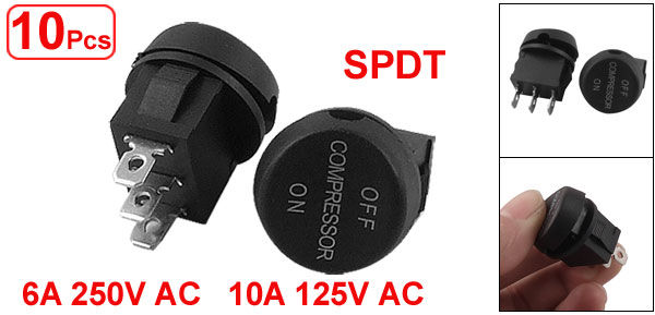 Product Name On/On Rocker Switch Poles SPDT Terminals Quantity 3 Pins Rating Voltage 6A 250V AC 10A 125V AC Mounting Hole Size 19 x 12mm / 0.75" x 0.47"(L*W) Overall Size 22 x 33cm / 0.87" x 1.3"(L*W*T) Color Black Material Plastic & Metal Total Weight 49g Package Content 10 x Rocker Switch - Reviews