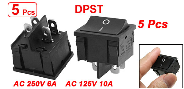 Product Name Rocker Switch Poles DPST Terminals 4 Pin (On-Off) Rating Voltage AC 250V 6A AC 125V 10A Total Size(Each One) 2.4 x 2.1 x 2.5cm / 0.9" x 0.8" x 1"(L*W*T) Mounting Size 2.2 x 1.9 x 2cm/ 0.86" x 0.75" x 0.78"(L*W*T) Color Black Material Plastic, Metal Total Weight 34g Package Content 5 x Rocker Switch - Reviews