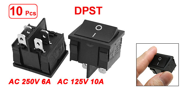 Product Name Rocker Switch Poles DPST Terminals 4 Pin (On-Off) Rating Voltage AC 250V 6A AC 125V 10A Total Size(Each One) 2.4 x 2.1 x 2.5cm / 0.9" x 0.8" x 1"(L*W*T) Mounting Size 2.2 x 1.9 x 2cm/ 0.86" x 0.75" x 0.78"(L*W*T) Color Black Material Plastic, Metal Total Weight 68g Package Content 10 x Rocker Switch - Reviews