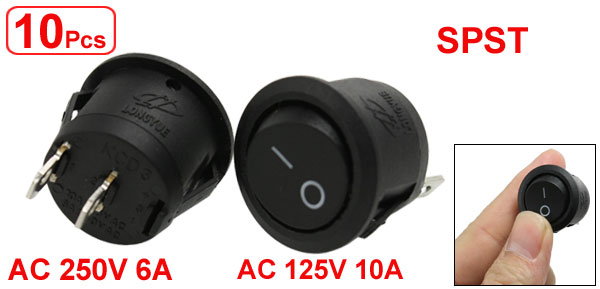 Product Name Rocker Switch Poles SPST Terminals 2 Pins Position On/Off Two Position Rated Voltage & Current AC 250V, 6A AC 125V, 10A Overall Size(Approx.) 23 x 29mm / 0.9" x 1.1" (Dia.*H) Mounting Size 20 x 15mm / 0.8" x 0.6" (Diameter*Depth) Color Black Material Plastic, Electronic Parts TWeight 46g Package Content 10 Pcs x Rocker Switches - Reviews