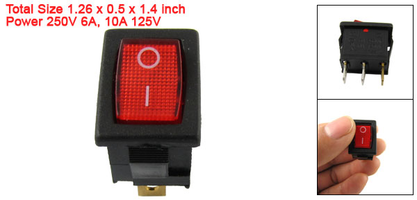 Product Name Rocker Switch Color Black, Red Material Plastic, Electrical Part Type KCD1 Single Throw Single Pole IndIcator Red Neon Power 250V 6A, 10A 125V Withband Voltage ≥1500V/Min Insulance ≥1000MΩ Contact Resisitance ≤50MΩ Max Press Number 10000 Total Size 3.2 x 1.3 x 3.5cm / 1.26 x 0.5 x 1.4 inch(L*W*H) Mount Hole Size 1.9 x 1.2cm / 0.75" x 0.47"(L*W) Distance of Each Pin 6.56mm Net Weight 5.1g Package Content 1 x Rocker Switch - Reviews