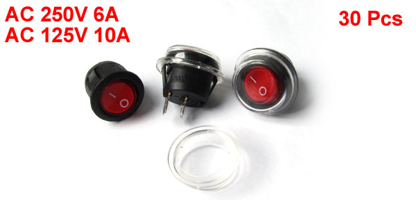 AC 6A/250V 10A/125V Red Light On/Off Snap in SPST Round Rocker Switch 30PCS